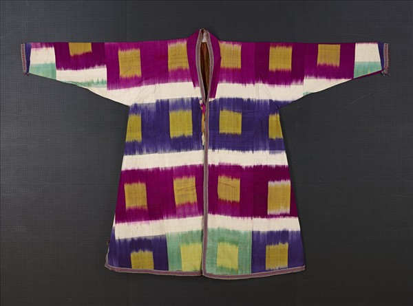 絲棉交織伊卡,內裡以棉布。表布以桃紅、紫、淺綠間以白色,相間成橫條紋,黃色方格點綴其間,具現代簡化幾何風格。袍服的門襟、下襬和袖口邊緣裝飾以織帶。