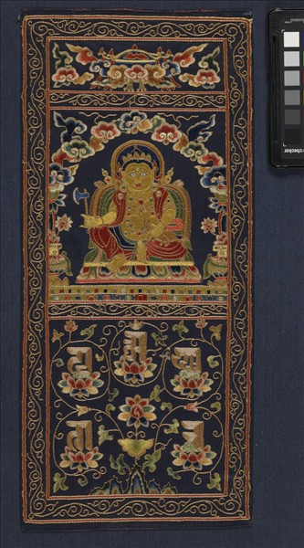 本幅繡財神,左手抱獴,右手持斧,與本院其他幾件繡幅同屬藏傳佛教之作。此批繡品起初曾定年為元代,但後來學界多半認為是明初之作,尤其和永樂年間製作最為接近。裝飾紋樣的細節及風格和十四世紀到十五世紀初的尼泊爾及西藏繪畫裡的表現相近,推測可能出自明初宮廷作坊,用作國禮,是重要的明初上乘之作。