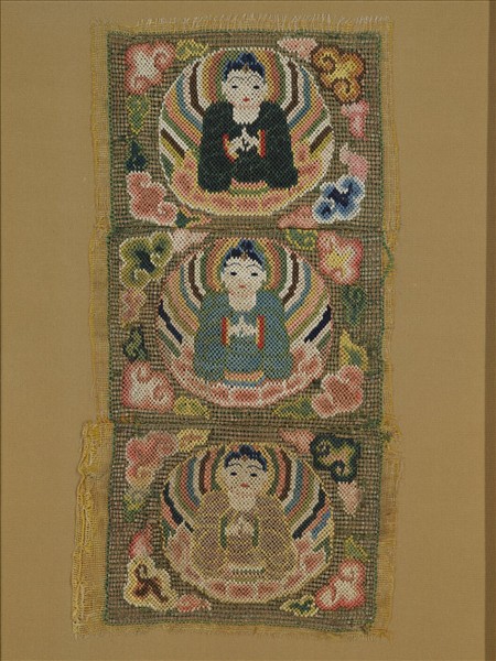 本品以納紗針法繡成,顏色豐富,造型古拙。現殘存三小坐佛,原本可能為袈裟之一部分。目前所知千佛袈裟多製作於十一至十五世紀之間,並有不少自西藏流出,除了全件完整例子之外,另有許多呈一列列小坐佛殘片形式,此幅或許也出自同樣背景。