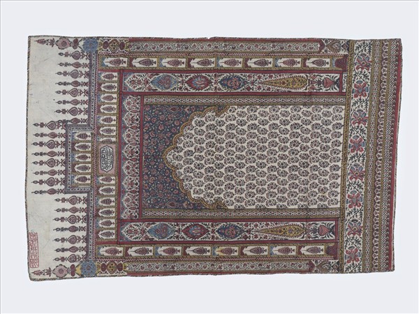 伊朗的繪染棉布泰半從印度進口,伊斯法罕雖也生產相類製品,但不如印度棉布物美價廉。這件繪染布掛飾,是印度專為波斯市場所製作的產品,生產地集中於印度東南沿海的默蘇利珀德姆。紋飾以紅藍為主色調,像是拱形的壁龕或拱門建物,彷彿要通往皇宮或清真寺。建築體的空隙處,無不填滿細密多彩的花卉紋或佩斯利紋。整體裝飾密集、紋樣細緻的面料,忠實地反映了波斯人對圖案和裝飾的熱情。 建築體的門楣開光內有阿拉伯文祈禱語,意譯為「讚美至高無上的真主,並將讚頌歸於他」。左上角的紅款印著波斯文:「由哈只——阿卡‧薩馬德——製作的繪染布」,「哈只」(hajji)原意為「巡禮人」,是曾到天方(麥加)朝覲的穆斯林的尊稱。目前雖沒有進一步的證據顯示這是一條祈禱毯,但這些款識讓我們更明確地了解它的使用者。