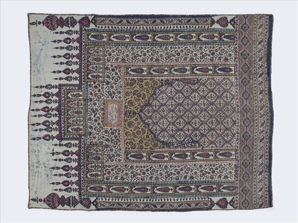 伊朗的繪染棉布泰半從印度進口,伊斯法罕雖也生產相類製品,但不如印度棉布物美價廉。這件繪染布掛飾,是印度專為波斯市場所製作的產品,生產地集中於印度東南沿海的默蘇利珀德姆。紋飾以紅藍為主色調,像是拱形的壁龕或拱門建物,彷彿要通往皇宮或清真寺。門楣開光內有阿拉伯文祈禱語「讚美至高無上的真主,讚頌歸於他」,讓我們知道它的使用者是穆斯林。門內採用經典的對波紋作為裝飾,而建築體的空隙處,無不填滿細密的多色花卉及佩斯利紋。