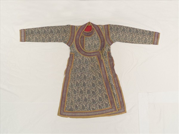 佩斯利花卉紋喀什米爾袍( Angarakha ),獨特的大圓領開口,前襟內附胸襠片,全身的衣領、開襟、下襬及袖口,袍服以佩斯利花卉為主要紋樣,全衣輪廓飾以蔓草花卉織金邊條及草綠色絲綢滾邊條,華麗精緻,應是男性皇室家族所用。