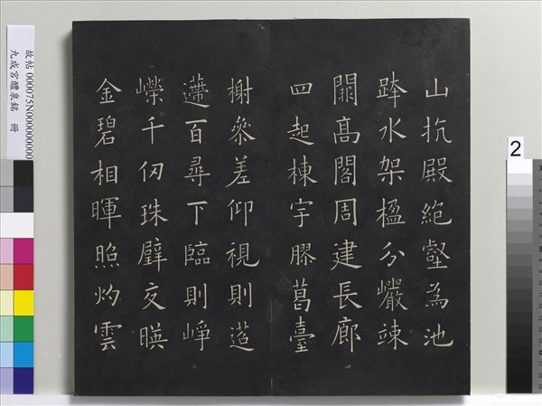 歐陽詢(五五七-六四一),字信本,湖南長沙人。任官至太子率更令,世人或以歐陽率更相稱。歐陽氏能作多種書體,而以楷書成就為高;傳世楷書碑刻又以貞觀六年(六三二)所書〈九成宮醴泉銘〉影響最深,得到「楷法極則」的美譽。目前〈九成宮醴泉銘〉碑石尚存陝西省麟游縣,由於歷代椎拓不絕,碑面磨損嚴重,世人或就流傳佳拓再行翻刻,本次展示的拓本即為清順治十三年翻刻本。(20110913)