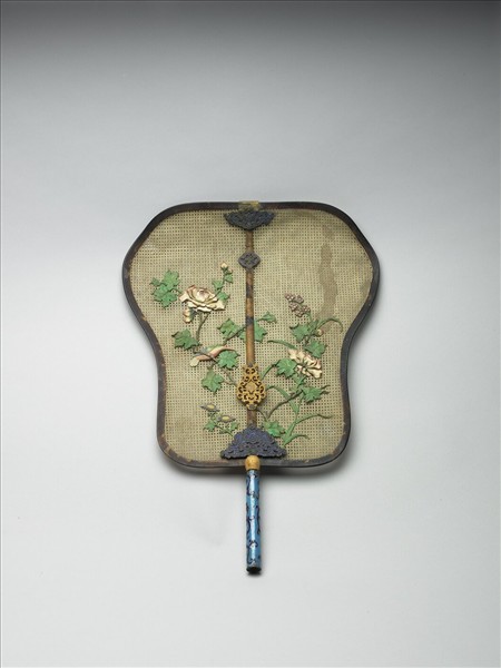 芭蕉葉形團扇面乃將象牙剖絲後編綴而成,周邊包鑲玳瑁框,內填琺瑯扇柄,湘妃竹(又稱「斑竹」)柄樑,其兩端嵌內填琺瑯雲福紋飾件。扇之正面於柄樑兩側嵌飾茜色折枝牡丹,左高右低,花朵或盛開,或含苞,一隻翠鳥立於左枝上,一小菊枝自扇面柄樑下端琺瑯飾件生出,二朵菊花盛開。所茜染之色有紅、淺綠、深綠、藍、深藍等。