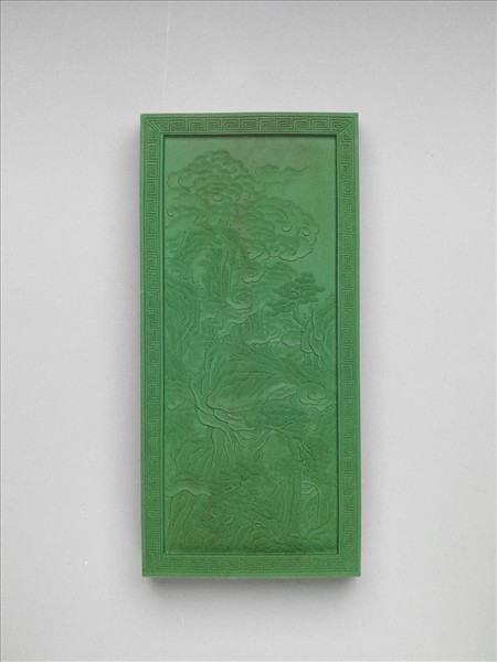 長方形綠色顏料墨,細膩鮮豔。雙面起邊框,皆飾回紋一圈,一面作填金楷書御題詩「御題萬壑春雲冊詩。從龍翔鳳結絪緼,洞壑英英吐白雲,出岫無心羣待族,筆端造化幻繽紛。」另一面模印奇石幻山間,勁松挺立朵雲繚繞。墨兩側各有陽文楷款「嘉慶己巳(1809)年製」、「臣董教增恭錄」。五色畫錠一套十件,共收於雙龍「御題萬春集慶冊五色畫錠」漆盒。