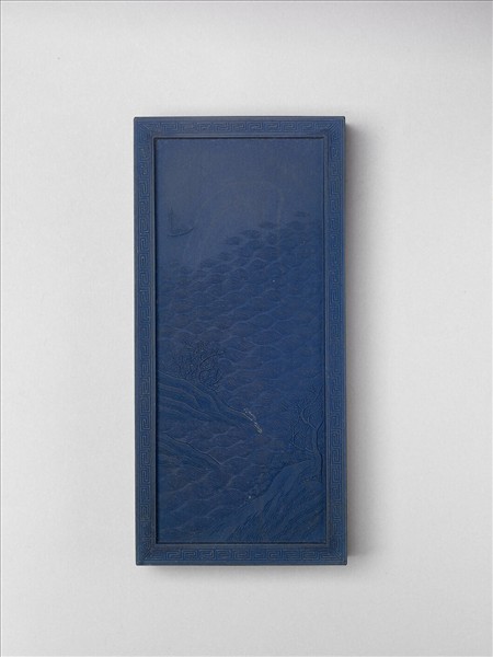 長方形藍色顏料墨,細膩鮮豔。雙面起邊框,皆飾回紋一圈,一面作填金楷書御題詩「御題萬派春濤冊詩。新水淪漣滿四澤,桃花初漲漾輕濤,挂帆擬欲遊天上,境象清幽散彩毫。」另一面模印大海波濤,中有孤帆徜徉其上。五色畫錠一套十件,共收於雙龍「御題萬春集慶冊五色畫錠」漆盒。