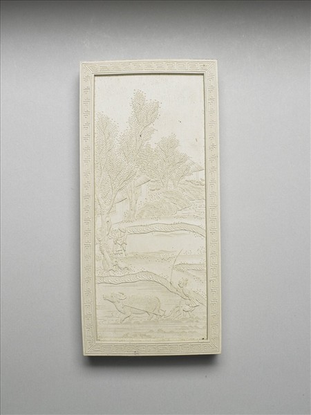 長方形白色顏料墨,細膩鮮豔。雙面起邊框,皆飾回紋一圈,一面作填金楷書御題詩「御題萬畝春耕冊詩。農功終歲始於春,東作初開覓土新,畎畝辛勤事畚鍤,恰連宿潤淨浮塵。」另一面模印初春時節,農人役牛耘田。五色畫錠一套十件,共收於雙龍「御題萬春集慶冊五色畫錠」漆盒。