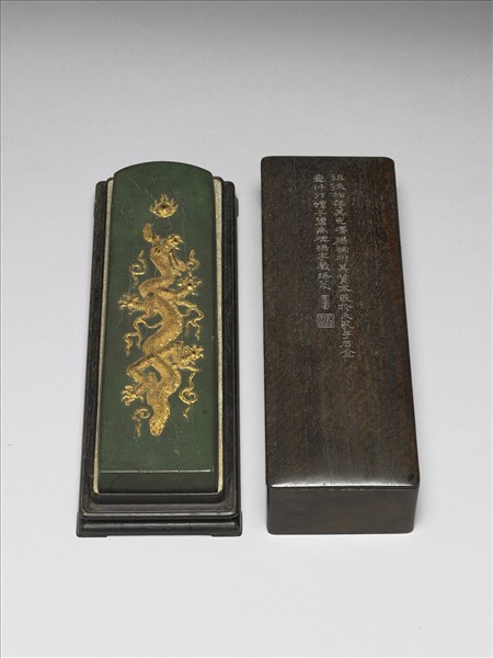 圓首長方墨,青綠色,外表斷紋多處。一面陽文漱金之龍趕珠紋,一面陰文篆字:「玄信」、「嘉靖年製」。墨原盛木盒內,盒蓋刻隸書銘:「徂徠松,存其色。嶧陽桐,研其質。不取於火取於石。金壺汁作螺子碧。禹碑綠字藏瑤笈。」印:「席上珍」、「乾隆御賞」。