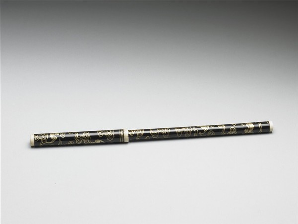 細長直筆管,狼毫,帶筆套。筆套及筆管為竹質,外壁髹飾黑漆地描金蝙蝠及流雲紋,兩端鑲飾象牙邊。