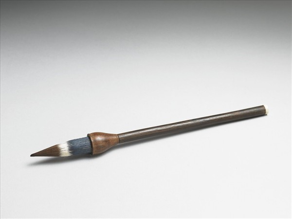 羊毫斗筆,紫檀木質細長筆管,下接木質筆管,筆管端作上窄下闊的斗狀,以容較多的筆毫,亦稱筆斗。管身仍細,使易於持拿,頂端飾象牙片,筆毫作紅、白、棕三色。