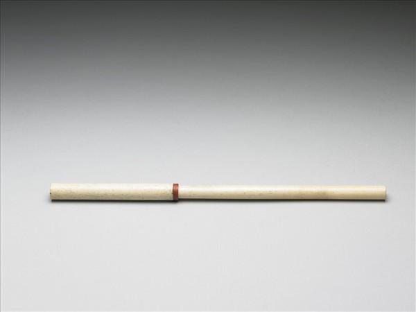 狼毫筆,鋒長而穎銳,筆腹微凸。筆管為骨質,其上無銘識,附有骨質筆蓋,蓋緣飾紅色料,整器素淨無紋。