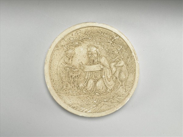 白色顏料墨,圓形,邊框起棱。一面模印南極仙翁童子圖像,就中仙翁坐而展卷熟視,童子陪侍於側,童子手正撫觸架上之容器,仙翁另一側則有一鹿望向仙翁。另一面之金線長方形框有「南極見則人主壽昌,天下太平」隸書金字,墨側有「方于魯監製」款識。該色墨一式五件,顏色彼此不同,分別為黃、綠、藍、白、紅,五塊色墨同儲於漆方盒中。