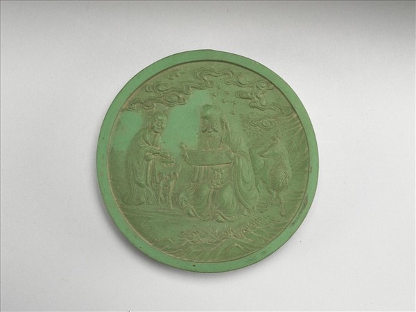 綠色顏料墨,圓形,邊框起棱。一面模印南極仙翁童子圖像,就中仙翁坐而展卷熟視,童子陪侍於側,童子手正撫觸架上之容器,仙翁另一側則有一鹿望向仙翁。另一面之金線長方形框有「南極見則人主壽昌,天下太平」隸書金字,墨側有「方于魯監製」款識。該色墨一式五件,顏色彼此不同,分別為黃、綠、藍、白、紅,五塊色墨同儲於漆方盒中。