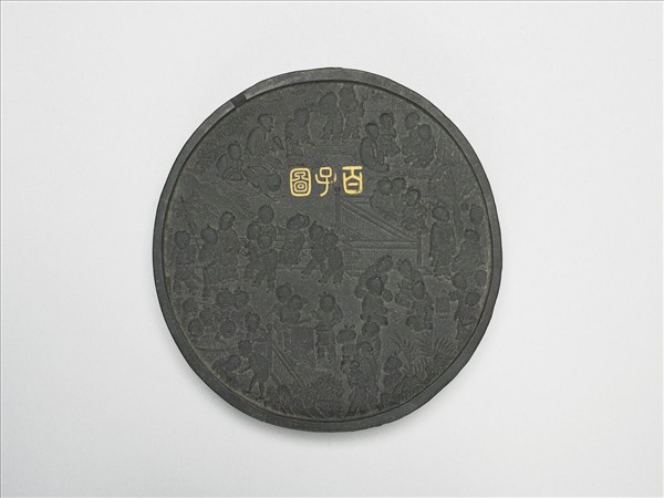 圓形墨,周起棱,邊角有小剝損。雙面皆模印百子圖,描繪眾小童於庭院或水邊嬉戲,動作表情生動,神態各異,熱鬧活潑,其中一面有填金刻「百子圖」。該墨置於一剔紅圓漆盒中。