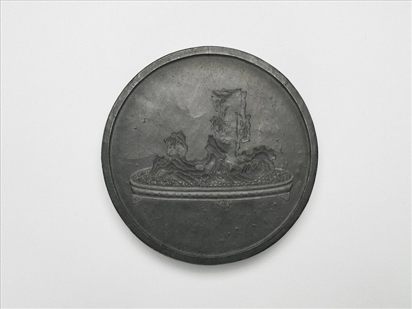 圓形墨,周起邊框,面佈滿小霉點。一面模印假山盆景石,迤邐嶙峋。另一面題「仇池石。一拳石,不盈尺,小有天,藏其隙,墨色淋漓,沉水碧池底,神魚幻無迹。」下鈐「建元」。墨側有陽文楷款「方于魯製」。該墨置於一圓漆盒中。