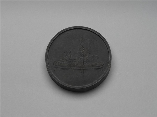 圓形墨,周起邊框,面佈滿小霉點。一面模印假山盆景石,迤邐嶙峋。另一面題「仇池石。一拳石,不盈尺,小有天,藏其隙,墨色淋漓,沉水碧池底,神魚幻無迹。」下鈐「建元」。墨側有陽文楷款「方于魯製」。該墨置於一圓漆盒中。