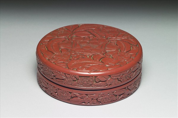 蔗段式盒,子母口,圈足,底部及盒內的黑漆似為後代重髹,原盒內清宮盛放仇池石墨。盒面為折枝茶花,橢圓形葉穿插其間,前後掩映,佈局圓且滿,花瓣翻折圓轉,枝葉健挺,清晰分明,生氣盎然。漆色紅潤,刀法直切,物象間黃漆顯露,花瓣、葉片起伏細膩,打磨圓潤,葉脈、瓣紋刻畫流暢。有條不紊的章法與精細嚴謹的工藝,充分表現永樂一朝高超的官方水平。側面為轉枝花卉,茶花、牡丹、菊花、梔子花,波浪狀的枝葉,花朵俯仰相間,兩兩成組,環繞不間。