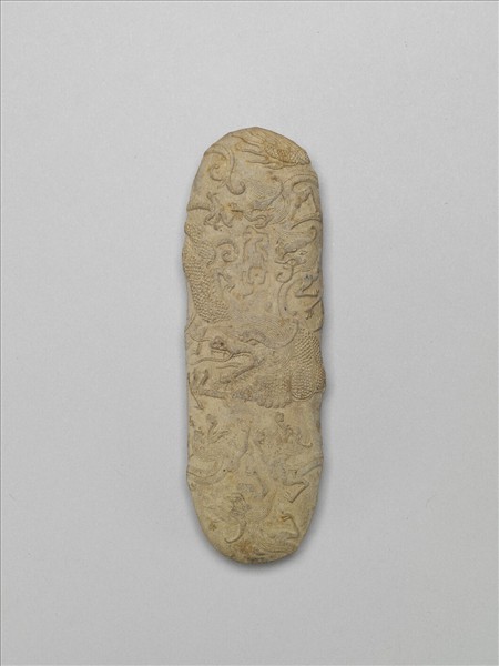 白色牛舌形墨,色略黃,整器表面滿覆龍紋,對照墨面所模印的「九子」篆款,可知龍紋是表現龍九子之圖象。另面在龍紋之間,則有「壬午年海陽方于魯珍藏」楷字。本末一式三件,同儲於木盒中。