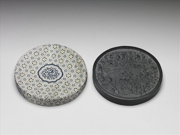圓墨,兩面均模印庭園中幼兒嬉耍百態,構圖以前景的樹石引導出近景,透過建築物區隔中景及遠景,近百名幼童成組由前中後橫列作帶狀分布在圓形的小空間中,疏密有致。墨模精緻,善用渾圓鼓起的弧面表現人體的立體感,眉目細膩,表情生動,姿態靈活,充滿熱鬧的氣氛。墨兩側壁陽文楷款:「天啟元年墨,蒼蒼室藏款」、「新都葉玄卿,按易水法製」。葉玄卿為明末著名製墨家。本作品款署天啟元年(1621),圖樣與《程氏墨苑》的「百子圖」幾乎相同。此墨墨體寬大,外表堅瑩,品質十分精良。