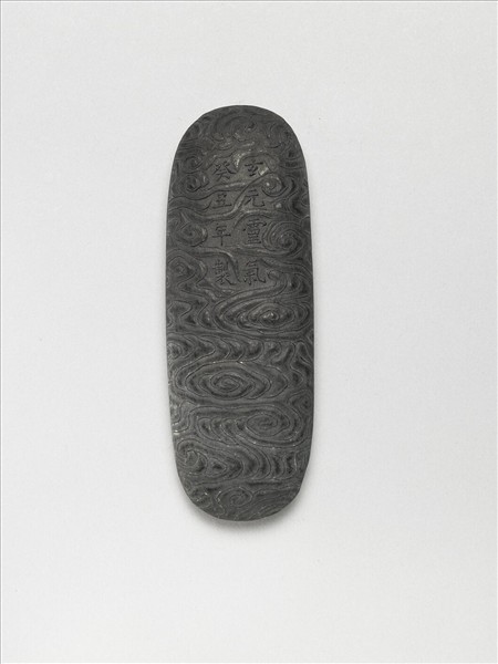 長橢圓牛舌形墨,表面略向外鼓,並滿覆雲氣紋,雲氣紋讓出的空間中,一面模印「玄元靈氣」、「癸丑年製」楷字(萬曆四十一年,1613),其中「玄元靈氣」的意義與表面的雲氣紋應該相關。另面則模印「東園主人家藏」、「君房氏」,此則指涉該墨與明代製墨家程君房的相關。另明代萬曆年間有徐泰自號東園主人,此墨或與徐泰有關。