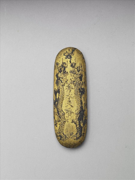 長牛舌形墨,一面模印雙龍戲火珠,雙龍之間模印「秀水天香」楷字款銘,另一面紋飾相同,中央模印楷字「羅小華製」,全墨漱金,部分金彩嚴重剝落甚。