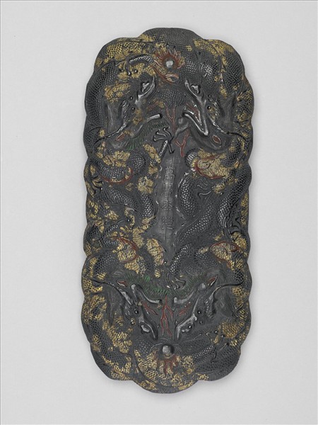 長方形墨。整墨以雙龍搶珠紋為主調,邊廓較不規則。龍身漱金、火紋填紅、龍髯漆綠,其配置則在墨面上下兩側各有兩龍交纏,其龍首分別往墨上下不同方向延伸,火珠則上下兩端各有一顆,便成為兩組雙龍搶珠圖樣,再加上墨面的多彩,整體相當熱鬧繽紛。另兩面分別有「萬曆年造」、「御墨龍香」篆款。