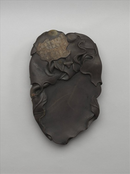 端石,硯作瓜葉形,石色棕赫,硯面間有火捺斑紋,隱隱若葉脈,質細而潤澤,兩面皆刻作瓜葉藤蔓縈繞其全器,葉間平坦處為硯堂,硯面上方,有二石眼,色碧黃,葉下隱隱有螽斯一,左上方一葉片,色棕黃,刻御製詩乙首,楷書,「質員潤復製精奇,兩面胥堪受墨宜,既盛既緜珍寶晉,周南大雅意兼斯。」款題「乾隆戊戌夏御題」,鈐印二:「古香」、「太樸」,按此詩亦著錄於《清高宗御製詩文全集》八,《御製詩》四集,卷五十一,頁十九。硯背刻大小瓜瓞三,并有石眼四,葉下平坦處,亦可作硯堂,大瓜上刻隸書,「寶晉齋珍玩」五字。