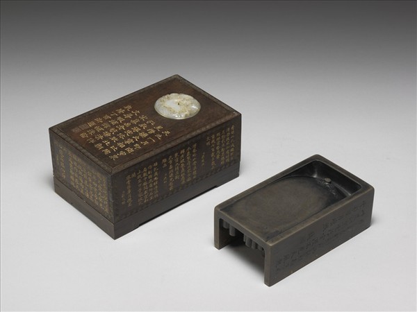 棕黑端石,太史式硯,池呈一字,池正下方有一眼柱,象徵明月,淺浮雕流雲環繞,墨堂尾端無欄;兩側壁高。硯背呈抄手樣斜下,斜面高下錯落六十餘眼柱,彷彿眾星在天。右側壁有陰刻行書銘署扥蘇軾。硯首側壁陰刻隸書清高宗銘及篆印。所附木盒蓋面陰刻相同隸書硯銘與款識,印:「幾瑕怡情」、「得佳趣」。