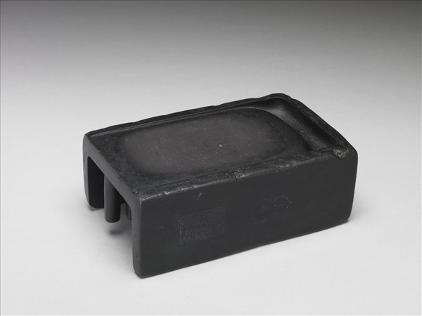 長方形高台抄手式硯,一字池,硯面三面有棱。石呈暗紫色。左側壁陰刻行書銘文。並陰刻行書款︰「子昂」。右側壁細陰線刻二印,一為細腰蒲蘆形篆書印:「子昂」,一為長方篆書印:「松雪齋珍藏」。硯首側壁陰刻楷書清高宗御製銘。