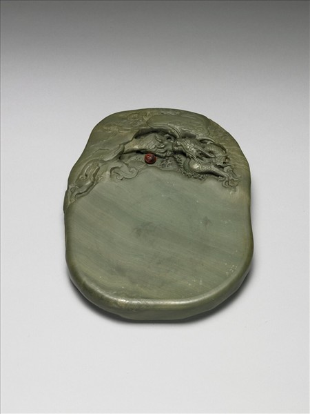 不規則長方形綠色石硯。硯首雕飾雲龍紋,一龍之龍首與龍身翻騰於波濤中,波濤漥下為池,池內嵌一褐紅色龍珠;池之左下方高浮雕一幼龍,回首望著後方的大龍,硯面上緣浮雕大龍,龍身若隱若現於雲層中。硯面周緣起棱,其內陷下一圈為墨池。硯面有一較粗長橢圓形作墨堂。中央陰刻行書銘:「一拳之石取其堅,一勺之水取其淨。」並刻方、圓印各一,圓者陰刻一行四字篆體:「體元主人」,印文上下分別陰刻乾卦與坤卦,左右各陰刻龍紋;方者陰刻二行四字篆體:「康熙宸翰」。引首陰刻一行二字篆體橢圓形印:「五雲」。左下隅陰刻楷書:「賜胤禛」。不規則長方形褐色木盒,子母口,盒背起寬棱,通體有一層盒黃色塗料。蓋面陰刻行書銘:「壽古而質潤,色綠而聲清,起墨益毫,故其寶也。」並刻方印二,一陰刻二行二字篆體:「康熙」,一減地浮雕二行四字篆體:「稽古右文」。左方貼一黃籤,墨書:「綠石硯一方。」從硯銘可知此硯乃清聖祖御賜清世宗之硯,當時世宗尚是皇子。