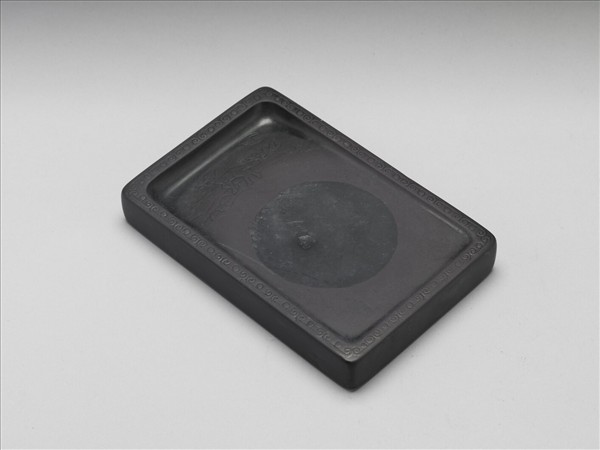 長方形硯,四周起邊框,硯背亦然。硯面邊框以陰刻技法雕飾一周幾何紋飾,硯面開斜通式硯堂,一端微凹成墨池,墨池處陰刻一鹿與蝙蝠,帶有「福祿」之吉祥涵意。鹿呈回首姿勢,背景有樹木與浮雲。硯呈灰黑色,附一黑漆硯盒。