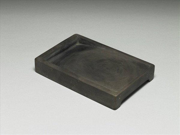 長方形抄手式硯,硯面四周起邊框,開斜通式硯堂,一端微凹成墨池,硯背呈斜坡式。全器光素無紋。硯呈灰黑色,附一紫檀硯盒。