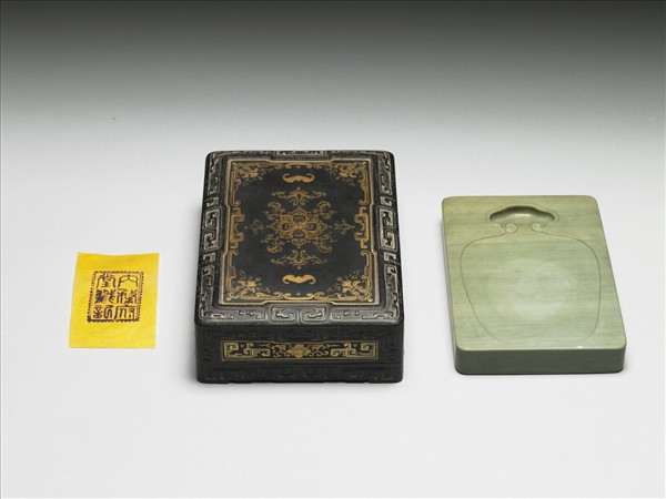 硯長13.1公分 寬8.7公分 高1.7公分;盒長14.9公分 寬10.6公分 高4.3公分