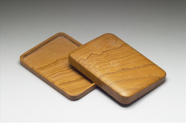 土黃色方形硯盒,通體有黃、褐色天然橫紋,似層層相疊之水波紋。盒背周緣起寬棱,並有一層褐黃色塗料。盒蓋有璺與破補。