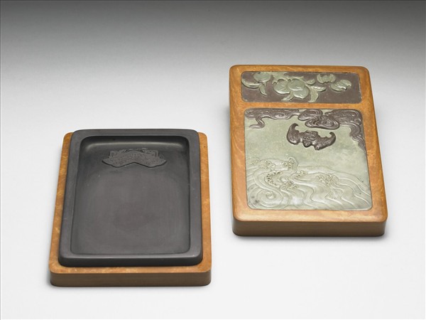 硯盒內裝盛一方紫色端石硯,ㄇ形池,池下方浮雕一磬,其上陰刻勾雲紋,磬之上方兩邊各浮雕一卍字作為磬鉤,兩鉤間又浮雕繩帶以相連。硯背周緣起一圈寬棱,中央由上而下陰刻四字篆體款:「雍正年製」。黃色方形硯盒,盒蓋與盒身藉硯身扣合。盒用黃色石琢製而成,通體有深淺不同紋理,側視層次清晰,蓋面紋飾乃另用綠紫二色石雕琢後嵌入,紋飾分作上下兩層,上層巧雕下垂桃枝,枝上結實四,兩隻蝙蝠繞枝飛翔,紋飾乃在紫色地上浮雕出綠色桃枝、桃實與蝙蝠;下層上方巧雕雲層,下方波濤洶湧,其間一隻蝙蝠向下飛翔,蝙蝠背部浮雕一「卍」字,紋飾乃在綠色地上浮雕綠色水波及紫色祥雲與蝙蝠。蓋面紋飾為吉祥圖案,上層寓意「福壽」,下層寓意「萬福」,合併之則有「福壽萬年」之意。盒背周緣起一圈寬棱,並有一層褐黃色塗料,中央由上而下陰刻四字篆書款:「雍正年製」。