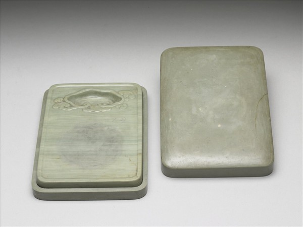 長方形松花石硯,綠色,通體有深淺不同之綠色橫刷絲紋。硯面留一較粗澀橢圓形墨堂,尚有墨痕,硯首處挖一如意雲頭紋小池為硯池,其周並淺浮雕雲紋多朵。硯背周邊起寬棱,中央凹下處陰刻行書銘「以靜為用,是以永年。」並鈐「雍正年製」。有灰綠色硯盒。