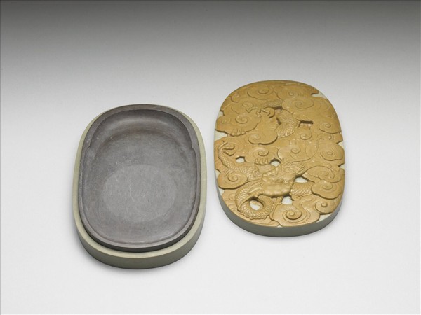 橢圓形紫色石硯,硯面周邊起棱,弧形池,硯面留下一表面較粗的圓形墨堂,餘皆打磨光滑。硯背周邊起寬棱,中央凹下處陰刻楷書銘:「出天漢,勝玉英,琢為研,純粹精,敕幾摛藻,屢省成。」款:「乾隆御銘」,並減地浮雕二行四字篆體方印:「幾暇怡情」。綠色橢圓形硯盒,盒蓋與盒身藉硯身扣合。盒用黃綠兩層色石琢製而成,盒身呈綠色,微泛黃,蓋面紋飾呈土黃色,巧雕一龍遨翔於雲層間,龍首位於上方,雙眼下望,炯炯有神。