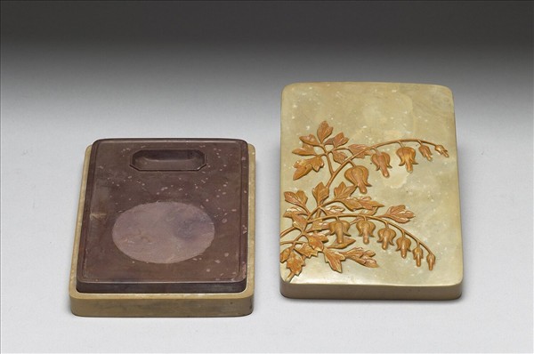 紫色方形硯,微泛白。硯面周緣起細棱,長八邊形池,池周亦起細棱。硯面有一較粗的圓形墨堂。硯背周緣起棱,中央凹下處陰刻楷書銘:「出天漢,勝玉英,琢為研,純粹精,敕幾摛藻,屢省成。」款:「乾隆御銘」,並陰刻二行篆體方印:「永寶用之」。硯之表面有不少缺損凹痕,並有璺與破補痕。淺綠色方形硯盒,盒蓋與盒身藉硯身扣合。盒用黃綠兩層色石琢製而成,盒呈淺綠色,通體泛黃,並有深淺不同淡黃色紋理。蓋面紋飾呈土黃色,巧雕折枝荷包牡丹,自蓋面左下角向右上方生長,花卉二枝,另一枝僅有葉。蓋面紋飾似一開冊葉。盒背周緣起棱,並有一層褐黃色塗料。