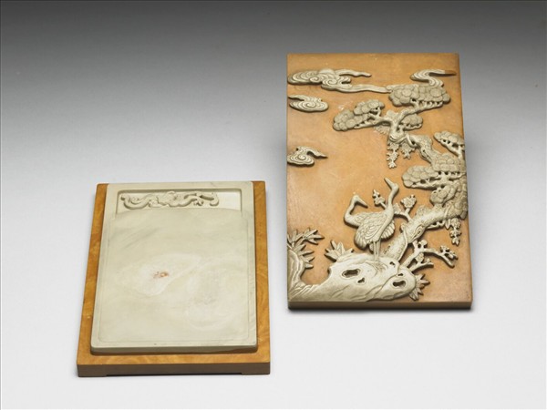 長方形硯,用黃綠二層色石製成,淡綠色層作硯身,土黃色層製成盒身,但尚有淺綠色斑;硯面微露黃色,並有二長形天然斑紋,略似端石之火捺紋。硯周陷下,以分別硯與盒身,並可與硯蓋成子母口相合。瓶形硯面,ㄇ形池,池內高浮雕一自右向左回首獨角夔紋。硯背周緣起寬棱,四隅各有一L形足,中央凹下處陰刻楷書銘:「出天漢,勝玉英,琢為研,純粹精,敕幾摛藻,屢省成。」款:「乾隆御銘」,並陰刻二行篆體方印:「永寶用之」。土黃色方形蓋,蓋用黃綠兩層色石琢製而成,蓋身呈土黃色,蓋面紋飾呈淺綠色,巧雕壽石、祥雲、叢篁、梅樹、老松與雙鶴。故文197雍正朝水波紋硯之硯池下方亦浮雕一回首獨角夔紋,與這件之夔紋相似,但夔首、尾與足爪不同,這件夔首較短,夔角與尾尚雕飾扭絲紋;而且二者身軀轉向不同。