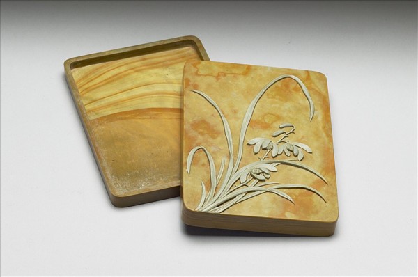 綠黃色方形硯盒,盒蓋利用黃綠兩層色石琢巧雕蘭花一株,自蓋面左下角向右上方生長,蘭花盛開者有三朵,兩朵含苞。盒背周緣起寬棱。