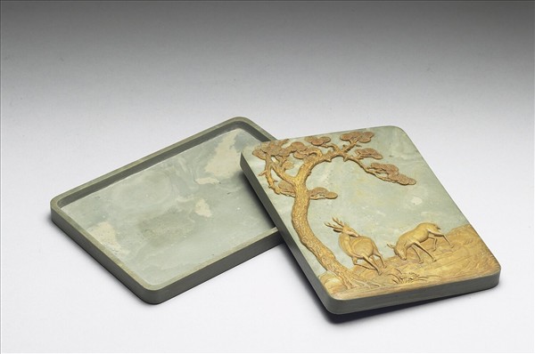 草綠色方形硯盒,盒蓋利用黃綠兩層色石巧雕而成,盒呈草綠色,並見淺綠色斑。蓋面紋飾呈綠黃色,自蓋面左下角向右上方延伸,巧雕松、鹿與坡石,樹一株,縱貫蓋面;鹿二隻,雄鹿回首看著低頭吃草的雌鹿;坡石上雕飾靈芝。盒背周緣起寬棱,表面並有一層褐黃色塗料。盒身已略破裂。