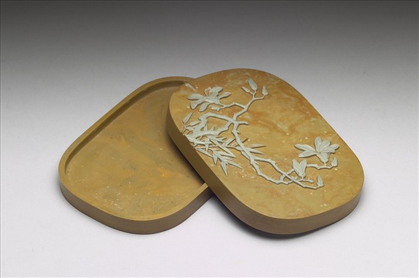 綠黃色長橢圓形硯盒,盒蓋利用黃綠兩層色石巧雕而成,盒呈綠黃色,通體有深淺不同黃色紋理,蓋面尚有淺綠色斑。蓋面紋飾呈淺綠色,雕折枝玉蘭花與竹枝,自蓋面左下方向右方生長,玉蘭花枝幹一分成二,花卉或盛開,或含苞;竹枝自玉蘭花枝幹下伸出。盒背周緣起寬棱,並有一層褐黃色塗料。