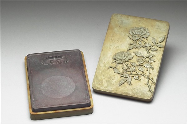 長方形紫石硯,硯堂寬闊中央有圓形淺凹處受墨,硯首處挖一如意雲頭紋小池為硯池。硯背周邊起寬棱,中央凹下處陰刻楷書銘「出天漢,勝玉英,琢為研,純粹精,勑幾摛藻,屢省成。乾隆御銘。」並鈐「永寶用之」。有黃夾綠松花石雕月季硯盒。