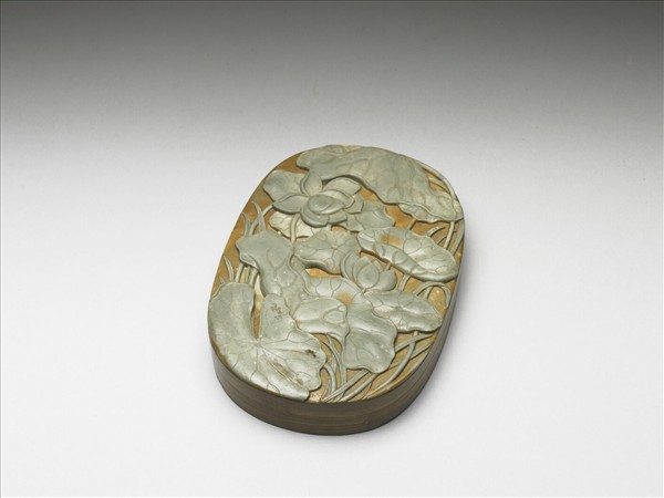 黃間綠色橢圓形硯盒,盒蓋利用黃綠兩層色石巧雕而成,蓋面紋飾呈暗綠色,雕荷塘圖,荷葉密佈,或仰或覆,仰者陰刻葉脈,覆者雙勾浮雕葉脈,其中一葉略有蝕痕;盛開荷花兩朵,一正,一側。盒背周緣起寬棱,表面並有一層褐黃色塗料。