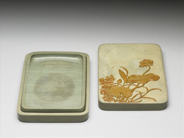 綠色方形硯,硯池下方淺浮雕一隻回首鳳,硯背中央處陰刻楷書銘:「出天漢,勝玉英,琢為研,純粹精,勑幾摛藻,屢省成。」款:「乾隆御銘」,並篆印:「永寶用之」。淺綠色方形硯盒,巧雕荷塘圖。