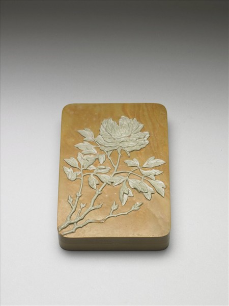 土黃色長方形硯盒,盒蓋利用黃綠兩層色石巧雕淺綠色折枝牡丹,自蓋面左下角向右上方生長,枝幹二,盛開牡丹一朵。盒背周緣起棱,並有一層褐黃色塗料。