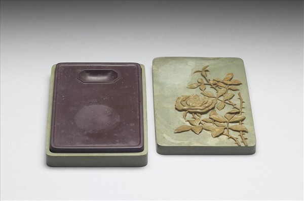 長方形紫石硯,中央有圓形墨堂,有長八角形硯池,全器光素無紋。硯背中央處陰刻楷書銘「出天漢,勝玉英,琢為研,純粹精,勑幾摛藻,屢省成。乾隆御銘。」並鈐「永寶用之」。有黃夾綠松花石雕月季硯盒。