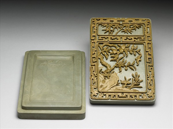 長方形綠色石硯,綠中泛黃,四周離邊棱約0.8公分處微突一圈作硯面邊界,ㄇ形池,池下方浮雕回首鳳,雙翅展開。硯周陷下,形成硯座,並與硯蓋成子母口相合。硯背周邊起寬棱,中央凹下處陰刻楷書銘:「出天漢,勝玉英,琢為研,純粹精,敕幾摛藻,屢省成。」並減地浮雕二行篆體方印二:「幾暇怡情」、「得佳趣」。綠色方形硯蓋,硯面突出,正可供硯蓋扣合。蓋用黃綠兩層色石琢製而成,蓋身呈綠色,微泛黃。蓋面紋飾成土黃色,紋飾分作上下兩層,浮雕框棱作為間隔。上層巧雕叢篁,下層巧雕一株桃樹,樹上結實纍纍,桃樹自坡石間伸出,石之右方生出靈芝與水仙,一隻蝙蝠翔於桃枝間。上下兩層紋飾之間與蓋之周邊雕飾仿古夔龍紋,四龍分成二組,一組環繞於蓋周,龍首兩兩相視於上端,一組間隔出上下兩層紋飾,龍首於中央相遇,又各自回望後方。蓋面紋飾為吉祥圖案,叢篁為竹,乃「祝」之諧音,桃實寓意「壽」,水仙即「仙」,蝙蝠之蝠是「福」的諧音,因此全部紋飾有「群仙祝福壽」之意。