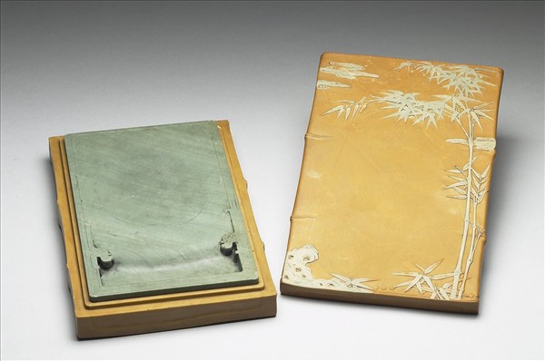 長方形綠色石硯,綠中泛黃,硯面周緣起棱,另上方與兩側又起ㄧ長形棱。ㄇ形池,池下方兩隅各浮雕一側身龍首,龍角與龍身向兩側延伸。通身有深淺不同天然斜紋,硯面與池內尚留有墨痕。土黃色竹節式硯盒,盒身與蓋以子母口扣合。盒呈三層竹節形。蓋用黃綠兩層色石琢製而成,蓋身呈土黃色,蓋面紋飾呈淺綠色,巧雕晴竹二株,高者貫通全形,小者僅及其半;左上方雕飾翔雲,左下隅雕飾山石。盒身用另ㄧ塊土黃色石琢製,亦作三層竹節形,側邊竹節紋與蓋面側邊竹節紋吻合,蓋與盒身下端皆浮雕近根部竹節鬚根之殘痕。蓋內陰刻楷書銘:「出天漢,勝玉英,琢為研,純粹精,敕幾摛藻,屢省成。」款:「乾隆御銘」,並陰刻二行篆體方印:「永寶用之」。