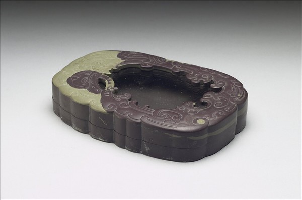 紫色橢圓形硯盒,盒用紫綠兩層色石巧雕而成,盒身為紫色,有十餘綠色不規則圓點,似端石中之「眼」,蓋面紋飾紫綠二色交雜,圍繞著周邊浮雕龍鳳紋;下方雕二龍,大龍首部居右,幼龍首部居左,上下錯位對望;上方雕一鳳,鳳首隔著中間鏤空部位望著雙龍,雙翼包覆。綠色部分集中於左上方,餘幾皆是紫色,間雜綠色,並有大小不同的綠點,蓋面中央嵌一玻璃,可透視硯面墨堂。